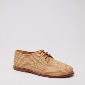 Una suela de cuero de primera calidad completa el zapato con una suave flexibilidad, durabilidad y un acabado pulido. Su tono cálido armoniza con la parte superior de rafia natural, creando una paleta cohesiva enraizada en el refinamiento de inspiración mediterránea. Su construcción es sólida pero ligera, lo que hace que este derby sea adecuado tanto para vestir de forma relajada como más elegante.
