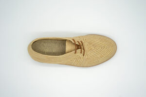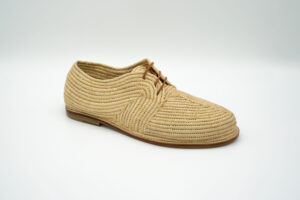 A handcrafted raffia laced-up shoe with a leather sole. The dried raffia leaves are hand-stitched around the shoe last in Morocco using different techniques resulting in unique patterns. The sole is made of leather, with a 5 mm rubber anti slip heel. This shoe is very light and open. Colour: natural.